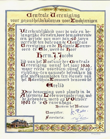 In 1962 werd Hermen J. Jacobs erelid van de Centrale Vereeniging. Dit wordt met een fraaie oorkonde bevestigd.