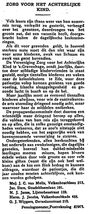 ‘Op de laatst gehouden algemene vergadering van de Centrale Vereniging van gezondheidskolonies voor zwakzinnigen heeft ondergetekende het secretariaat overgedragen aan de heer T. Gerh. Prins, Wittenburgerweg 68 te Wassenaar, Tel. K 1751 – 9565. Alle correspondentie voor het bestuur bestemd gelieve men dus voortaan te richten aan dit adres.’ (Jacobs, 1953a, 134).
