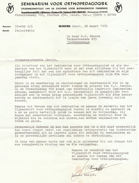 Hermen J. Jacobs bleef tot het laatste uur de ontwikkelingen van de opleidingen volgen. En als hij de jubileum bijeenkomt in de RAI te Amsterdam niet kan bijwonen, schrijft hij een brief. En hij krijgt daarop antwoord.